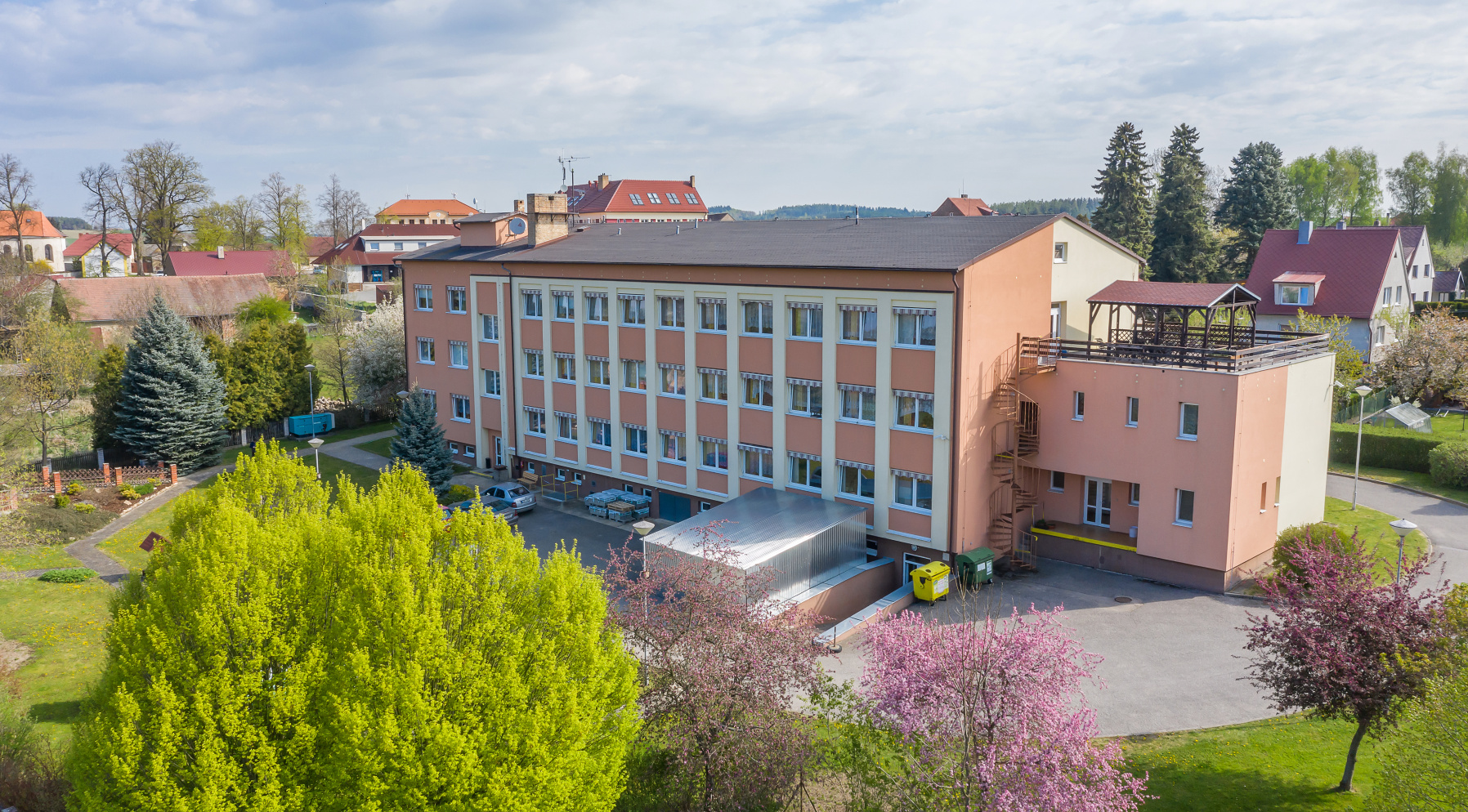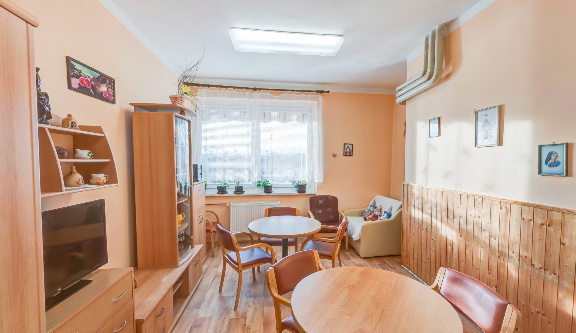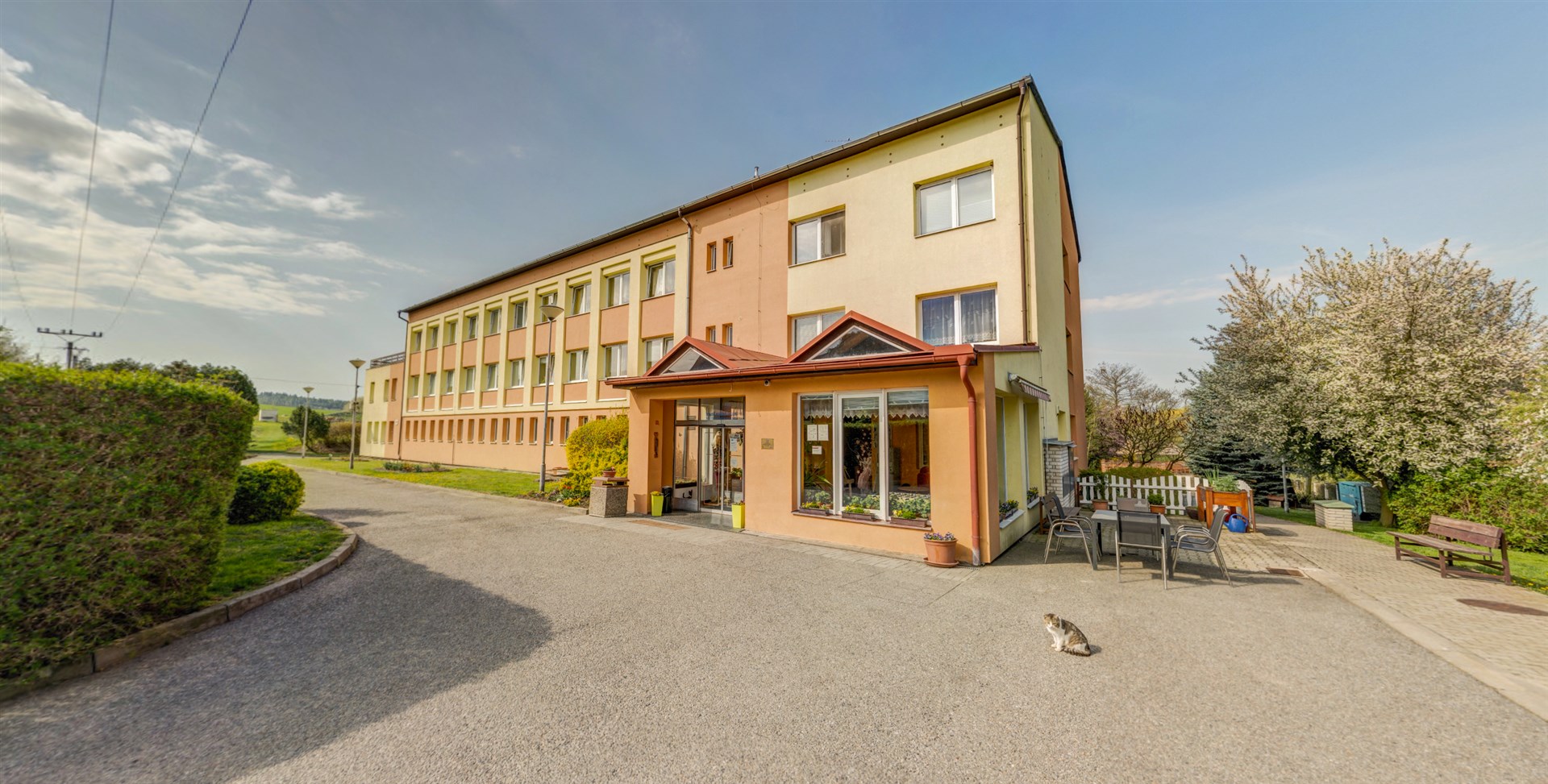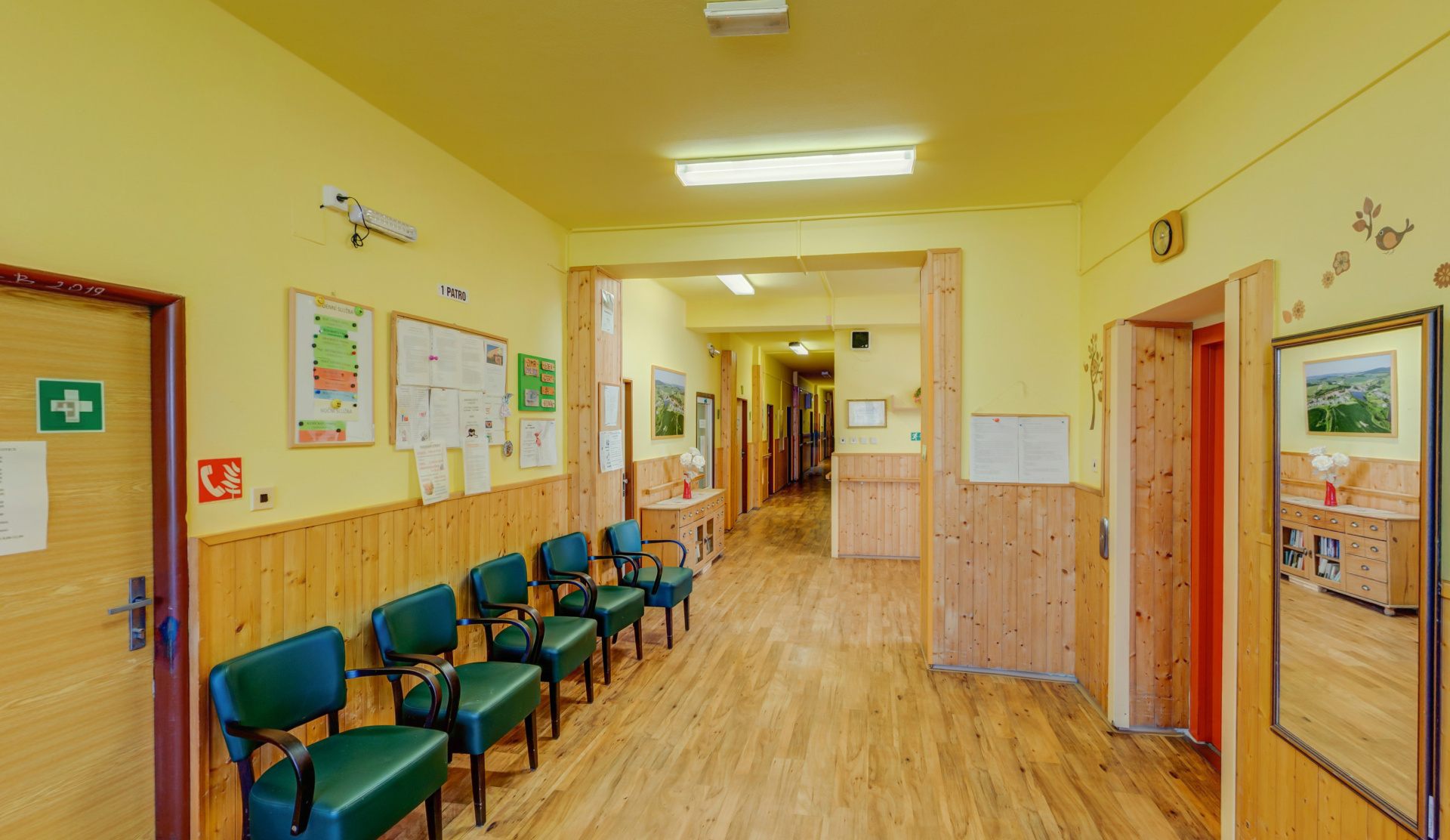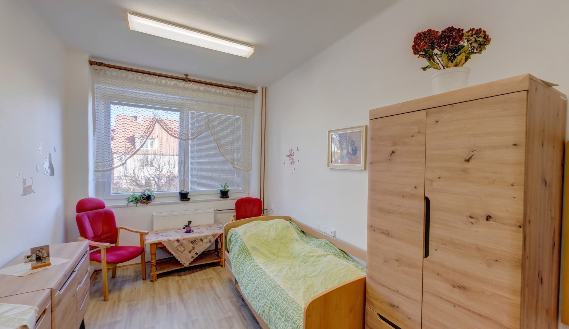 Druhé patro - 15 pokojů, sesterna, místnost paliativní péče, kancelář soc. pracovnice, terasa, společné soc. zařízení, koupelny, terasa.